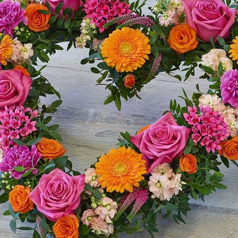 A vibrant combination of blooms including roses, carnations, and stocks, in a beautiful open heart design.