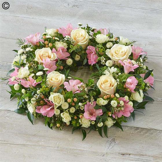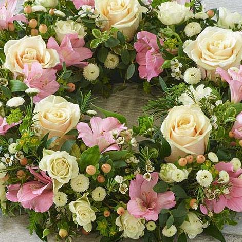 A beautiful pastel mix of soft pink, peach and cream. Featuring roses, chrysanthemums and delicate foliages.