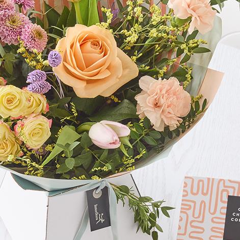 A handmade bouquet of fresh flowers in soft pastel shades, plus a selection of scrumptious chocolates.